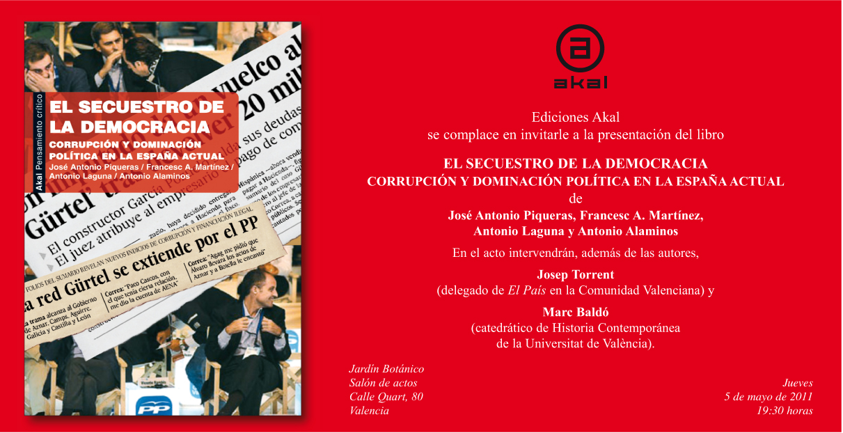 Vídeos (I y II) de la presentación del libro El secuestro de la democracia. Salón de Actos del Jardín Botánico (Universitat de València), 5 de mayo de 2011: