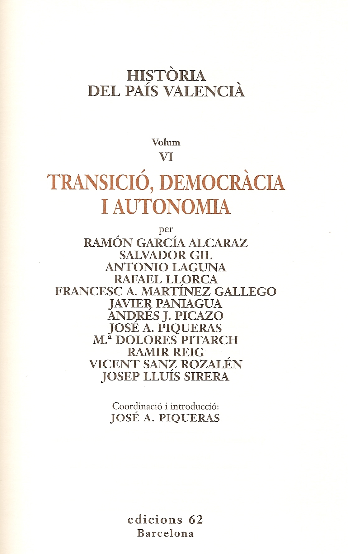 Sobre el país que habita ha escrito y dirigido varios textos. El (pen)último fue Transició, democràcia i autonomia, volumen VI (y último) de la Història del País  Valencià (Grup 62, Barcelona, 2006) que hacia 1965 iniciaran Miquel Tarradell, Manuel Sanchis Guarner, Joan Reglà y Joan Fuster, personalidades ilustres de las letras y la historiografía catalano-valencianas. Acompañado de buenos especialistas, se ofreció al lector una perspectiva inédita de treinta años de historia del presente de esta suerte de Bosnia ibérica que nos ha correspondido en suerte.